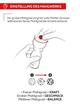 - Pfeffermühle: Zum Mahlen von schwarzem, weißem, grünem oder rotem Pfeffer, rosa Beeren (maximal 15% in einer Pfeffermischung) und Koriandersamen